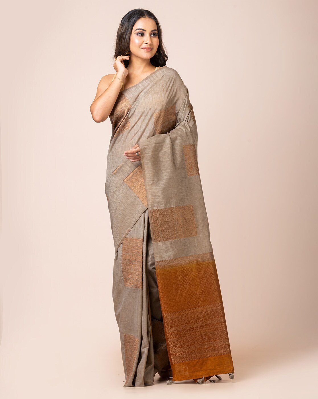 • The last image gives a detailed look of the blouse piece that comes with this saree (The model is wearing a blouse from our in-house wardrobe)